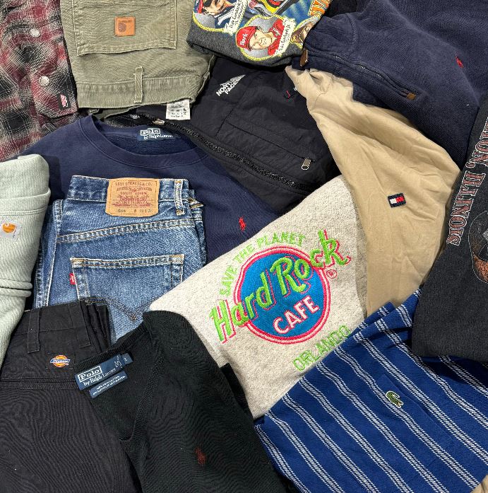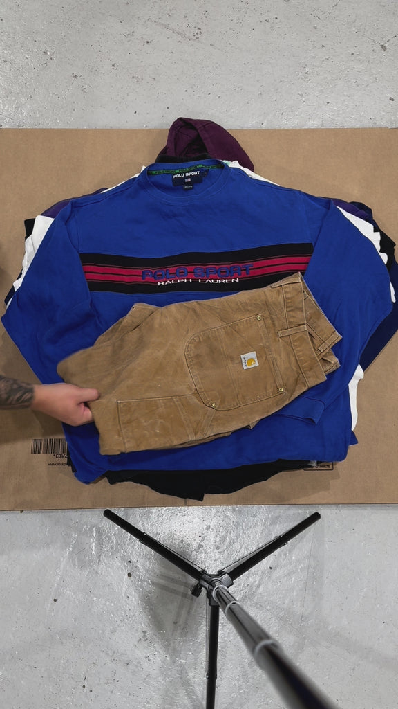 You will find classics such as Nike, Ralph Lauren, North Face, Harley Davidson, Carhartt, Dickies, Levi's, Adidas and much more. Please note the videos provide an example order and not the exact items you will receive in each order.